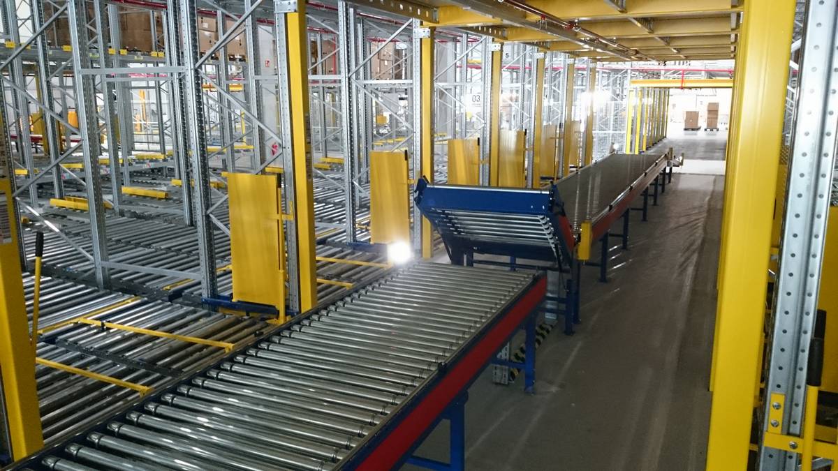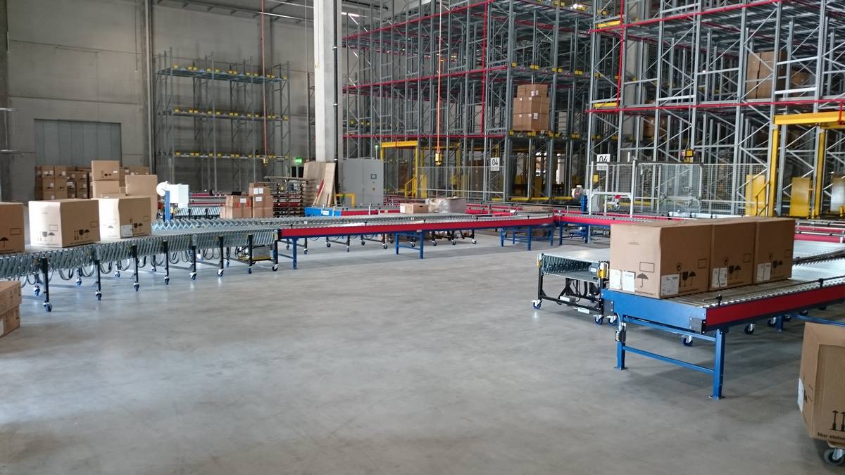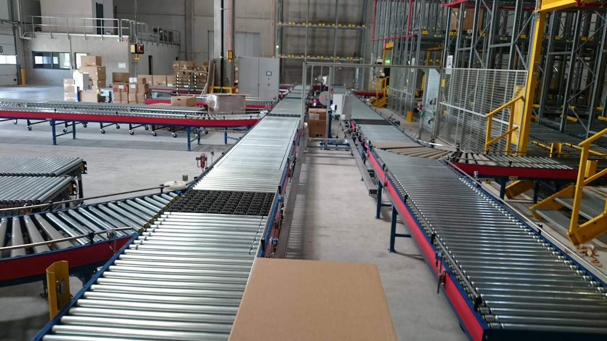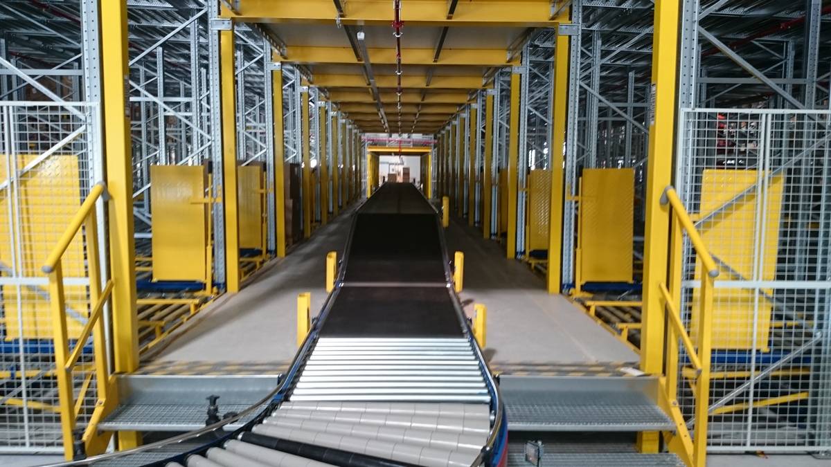- The hall was already built, and the 12-meter-wide conveyor corridor could not be built with stationary conveyors.